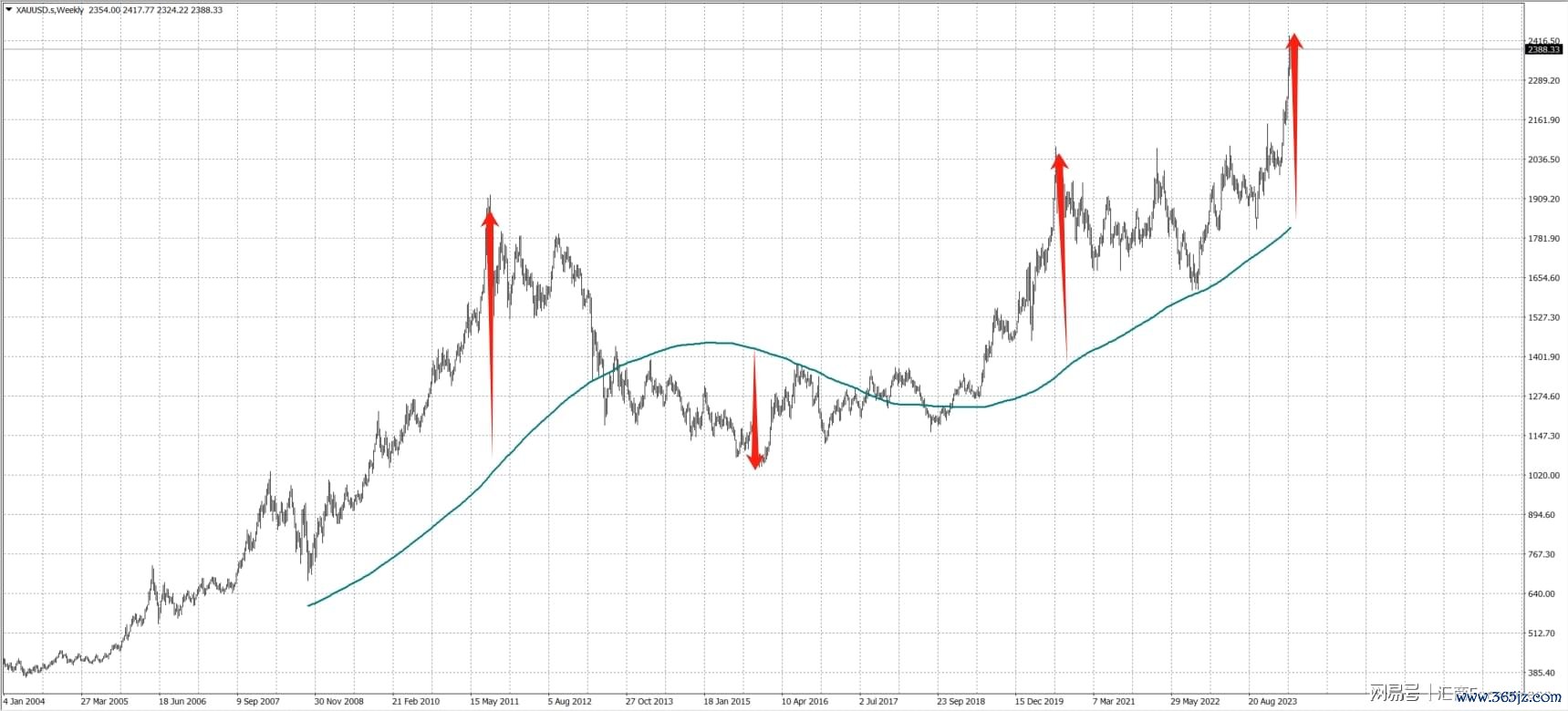 在经济学中有一个均值回首的认识,即是价钱不能能偏离均值太久。是以通过均线,咱们也不错识别是否是见顶的信号。以黄金走势为例,从历史上看,每次独一大幅偏离250周线,之后王人会向250周线靠近,从这少许上来说,面前的黄金走势靠近回调的风险很大。