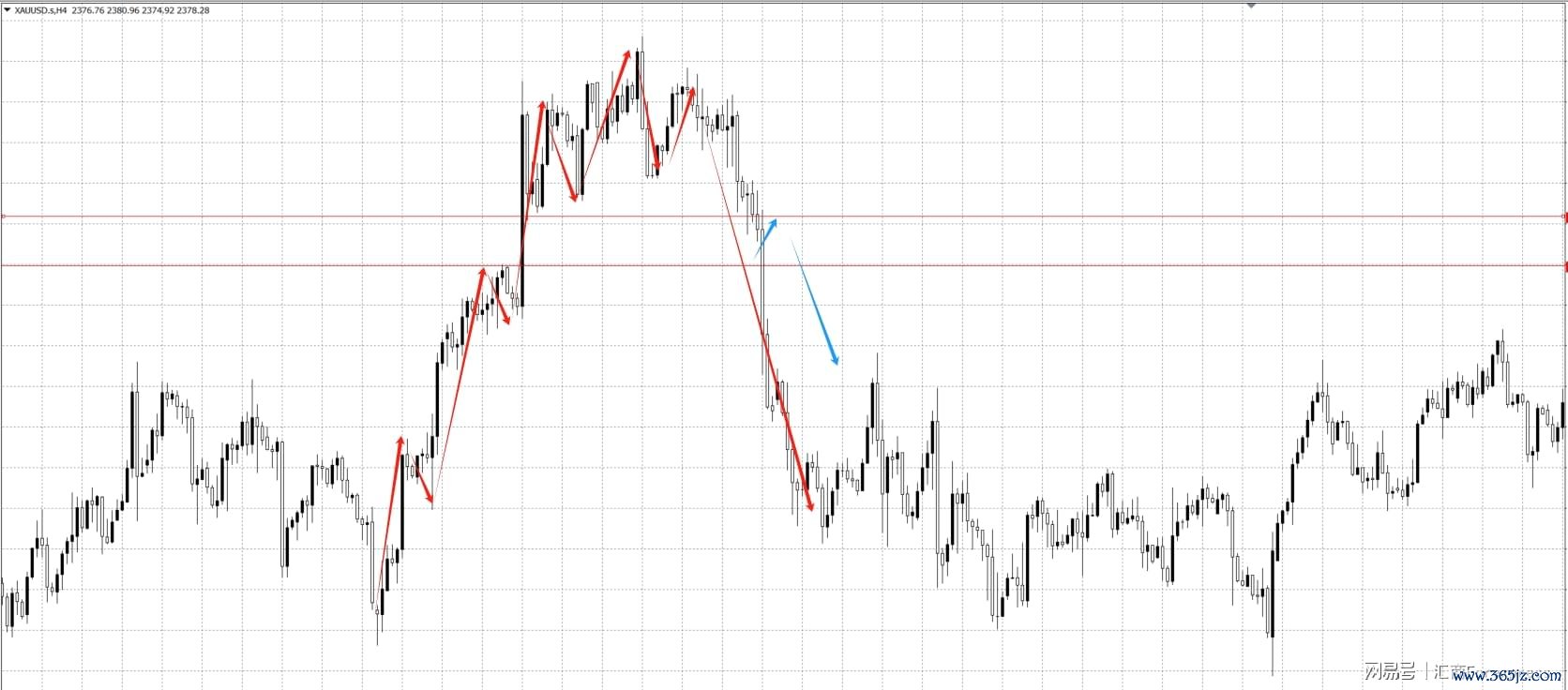 当飞腾趋势中,最新的一个高点低于前一个高点时,评释多头也曾无力拉动价钱。若是此时最新低点也低于前一个低点,将进一步说明作念空的信号。