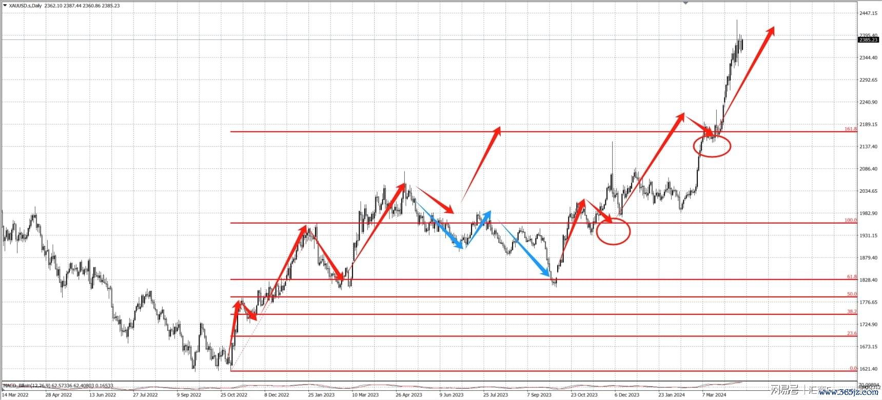 如下图,当运行到三浪时,一般五浪飞腾致使五浪延迟,很可能会涉及161.8%分位。不外赫然多头莫得得手,在回踩61.8%分位完成三浪回调后才开启了新一轮飞腾行情,并最终突破了161.8%分位。