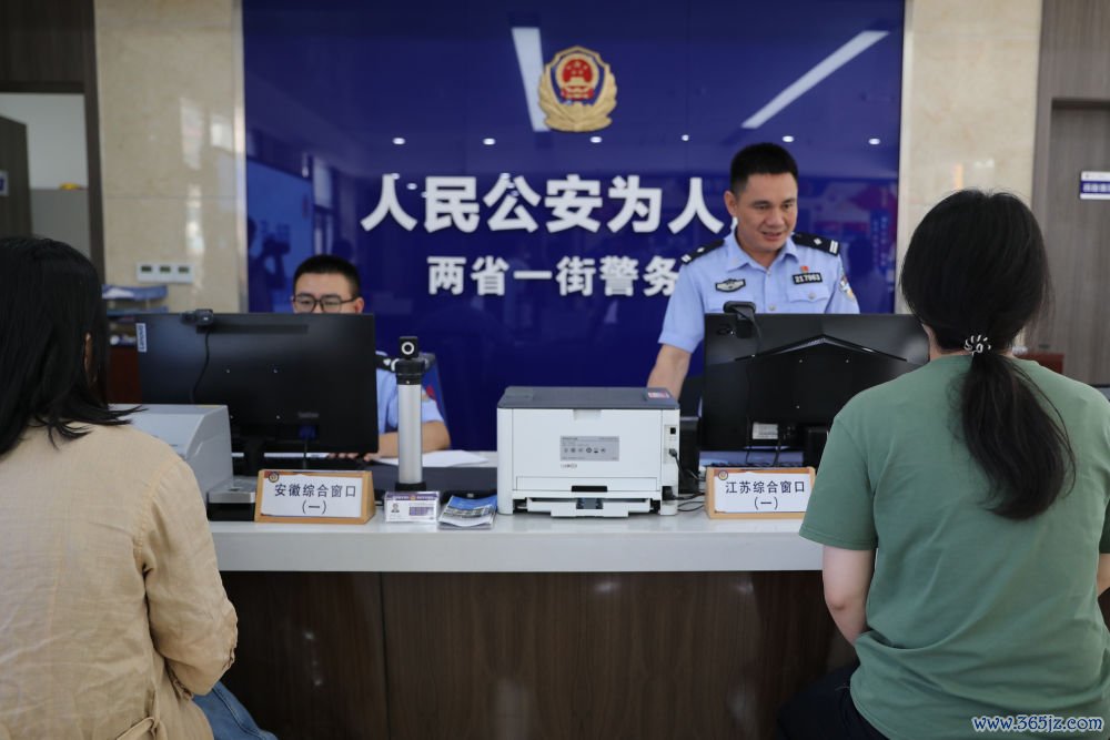 2023年6月2日,安徽的辅警(左二)和江苏的民警(右二)在丹阳警务室政务服务窗口为东谈主们办理业务。安徽马鞍山博望区丹阳镇与江苏南京江宁区丹阳社区相毗邻,2023年年2月底,苏皖“两省一街”丹阳警务室政务服务窗口确认揭牌,在两地接壤区域实体化入手。新华社记者 杜潇逸 摄