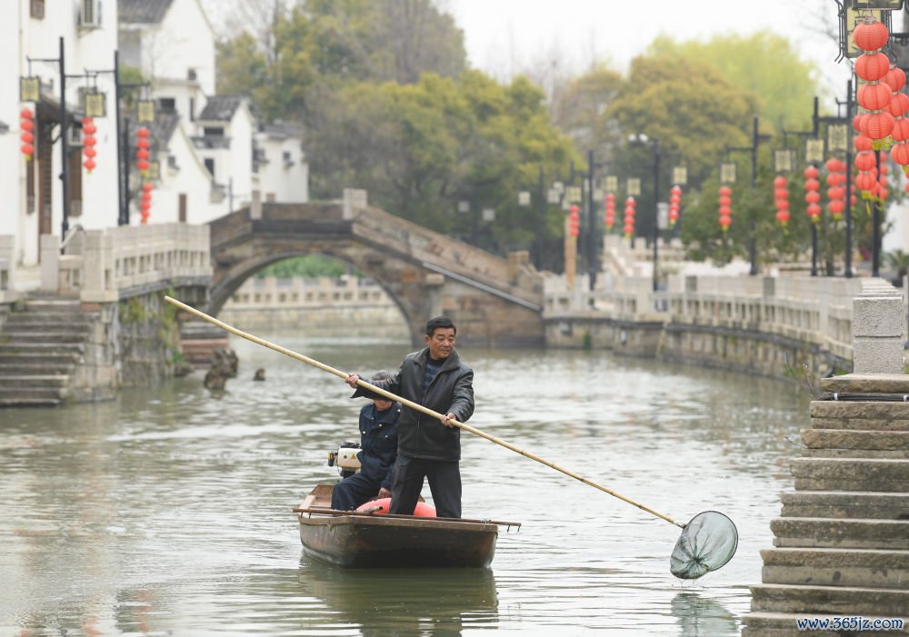 2023年3月16日,在太湖畔的浙江省湖州市织里镇义皋村,保洁员在清算河谈。多年来的溇港整治使得太湖把握河谈水质较着改善,也为乡村旅游注入能源。新华社记者 翁忻旸 摄