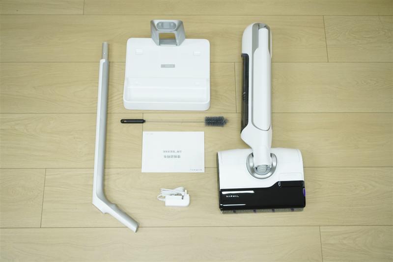 云鲸F1冠军版的包装里面,除了洗地机主体外,还附赠了操作杆、自清洁底座、清洁刷、适配器以及产品使用确认书。
