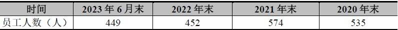 从上表可见,刊行东说念主的东说念主数从2021年末的最高574东说念主,下落至2023年上半年末的449东说念主,职工东说念主数减少了125东说念主之多,下落比例约为21.78%。