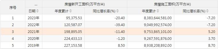 比刊行东说念主收入下落情况可能更严重的是,我国自2021年度后房地产行业成立情况的大幅下滑,近五年我国房屋新开工和施工面积数据情况,如下表所示: