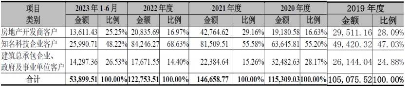 基于刊行东说念主对房地产行业的“精确预判”,招股书中对去房企化的深切也相等彰着,伊始表当今主营业务收入来自于房企的低占比,洗心革面的是科技明星企业客户,刊行东说念主败露的按客户分裂的主营业务收入组成情况,如下表所示: