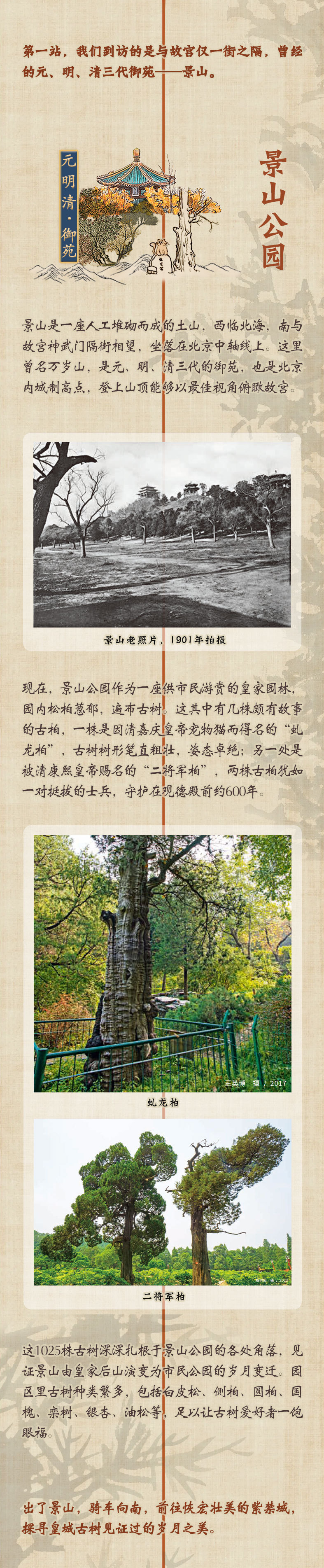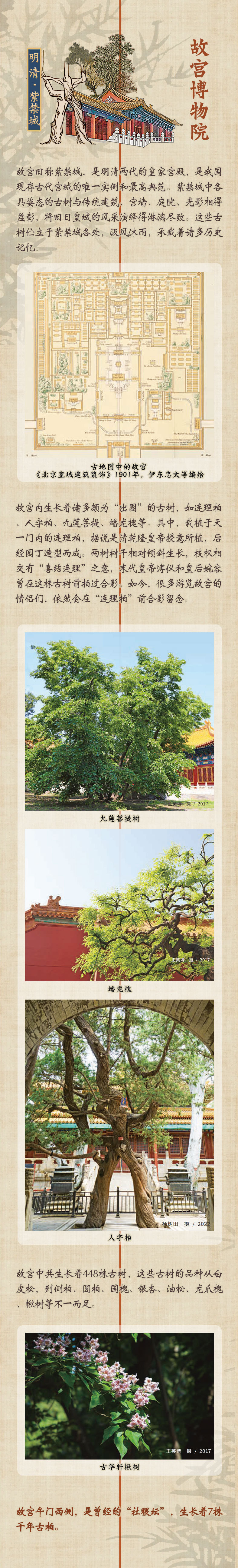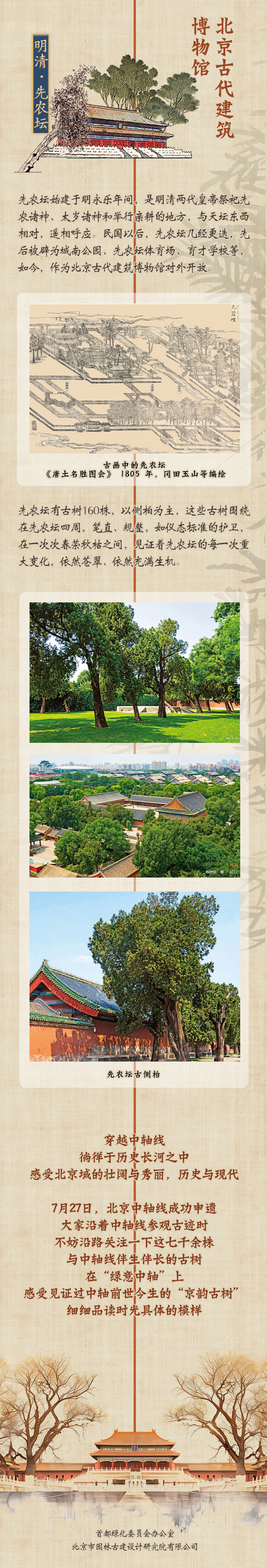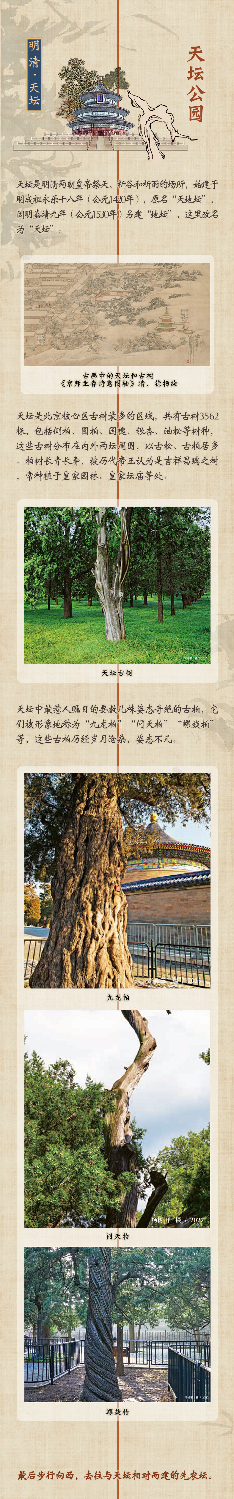 经由对北京中轴线沿线的古树资源的梳理,齐门绿化委员会办公室相连北京市文化和旅游局十分推出北京中轴线古树主题游线。游线波及中轴线沿线的景山、故宫、社稷坛、太庙、天坛、先农坛,六大古树群约6600株特质古树,诚邀市民旅客打卡,在名胜遗迹中感受古树的魔力,时光变迁之好意思。