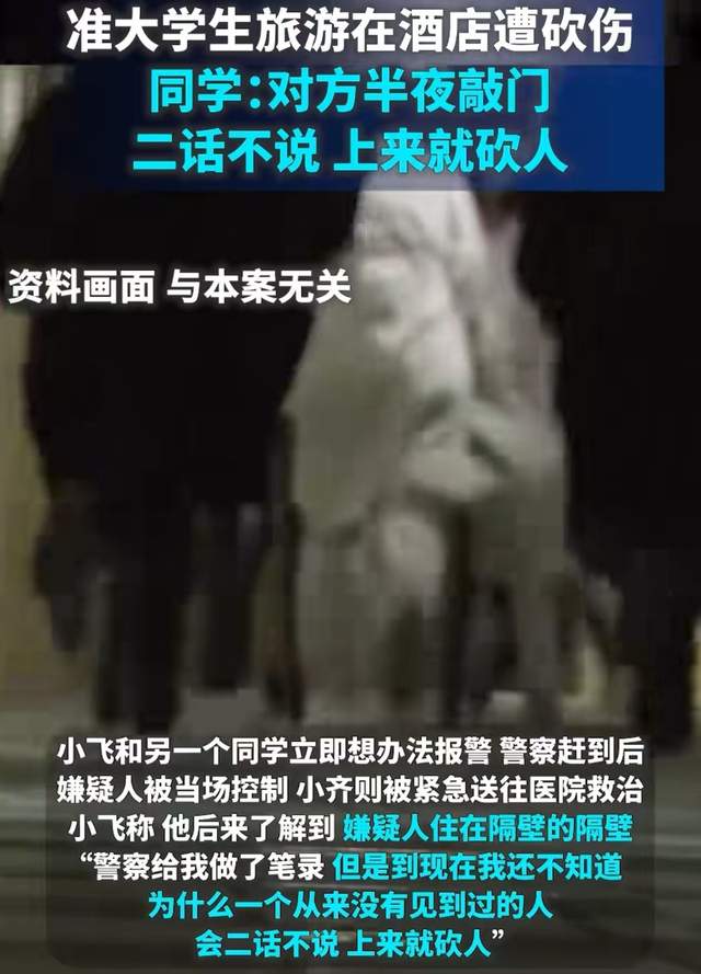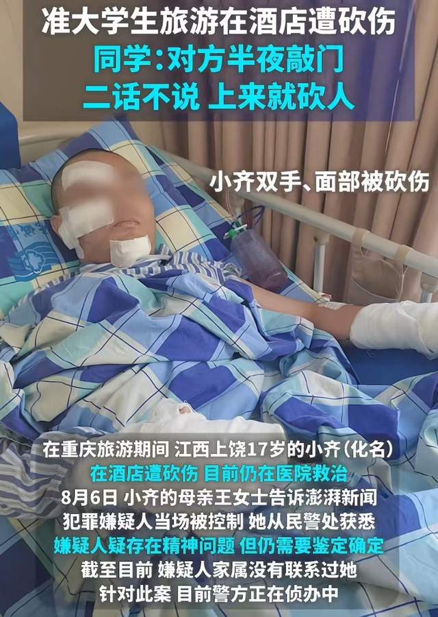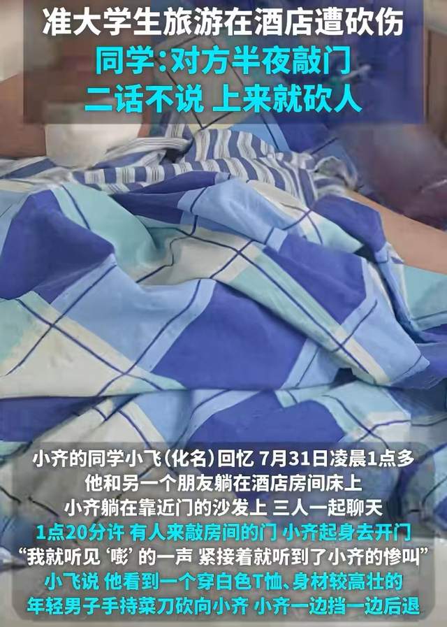 8月7日,有媒体报谈:江西上饶的17岁小皆(假名),在旅游入住的旅馆本事,被近邻房须眉持刀砍伤,现在正躺在病院里采纳调节。