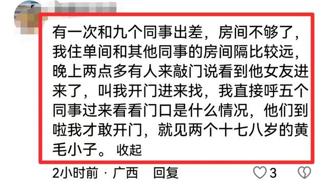 有一次和九个共事出差,房间不够了我住单间,和其他共事的房终止比拟远,晚上两点多有东谈主来叩门说看到他女友进来了,叫我开门进来找,我径直呼五个共事过来望望门口是什么情况,他们到了我才敢开门,就见两个十七八岁的黄毛小子。