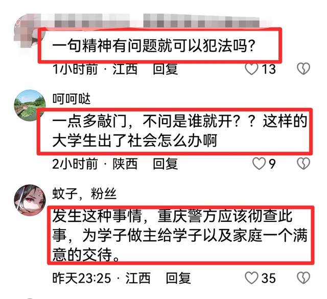发生这种事情,重庆警方应该彻查此事,为学子作念主,给学子以及家庭一个沉着的交待。