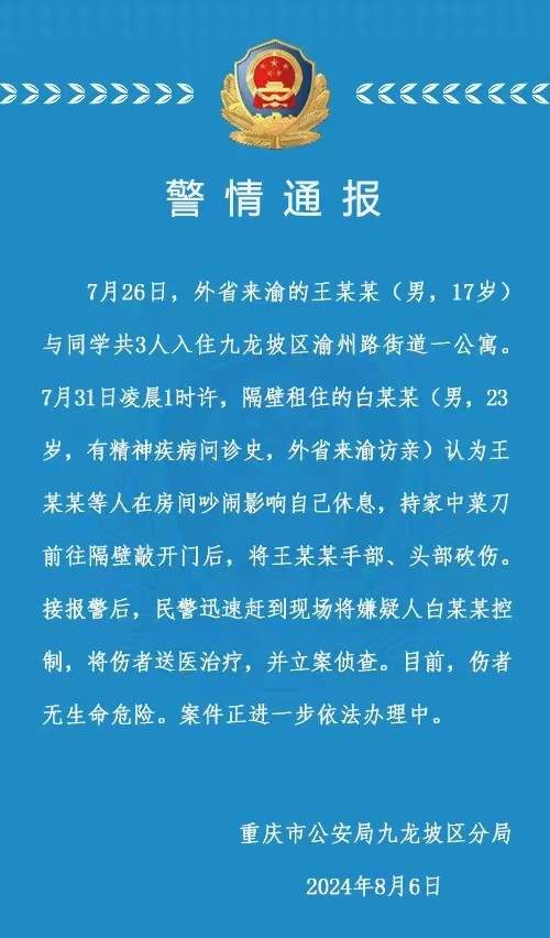 8月6日,重庆市公安局九龙坡别离局发布《警情通报》,阐述嫌疑东谈主有精神疾病问诊史,现在案件正在进一步侦办中。